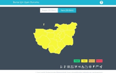 Bursa’da yarın için sağanak ve yer yer gök gürültülü sağanak yağış beklendiğini açıklayan Meteoroloji, 30 Ekim Cuma günü saat 12.00’den 23.59’a kadar ’sarı’ uyarı yayımladı.