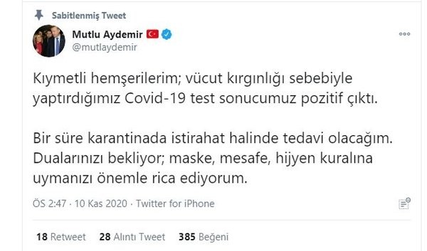AK Parti Balıkesir Milletvekili Pakize Mutlu Aydemir: 'Vücut kırgınlığı sebebiyle yaptırdığımız Covid-19 test sonucumuz pozitif çıktı. Bir süre karantinada istirahat halinde tedavi olacağım. Dualarınızı bekliyor; maske, mesafe, hijyen kuralına uymanızı önemle rica ediyorum.'