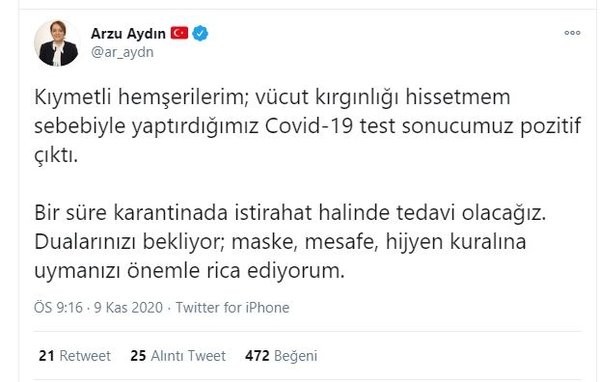 AK Parti Bolu Milletvekili Arzu Aydın: 'Vücut kırgınlığı hissetmem sebebiyle yaptırdığımız Covid-19 test sonucumuz pozitif çıktı. Bir süre karantinada istirahat halinde tedavi olacağız. Dualarınızı bekliyor; maske, mesafe, hijyen kuralına uymanızı önemle rica ediyorum.'