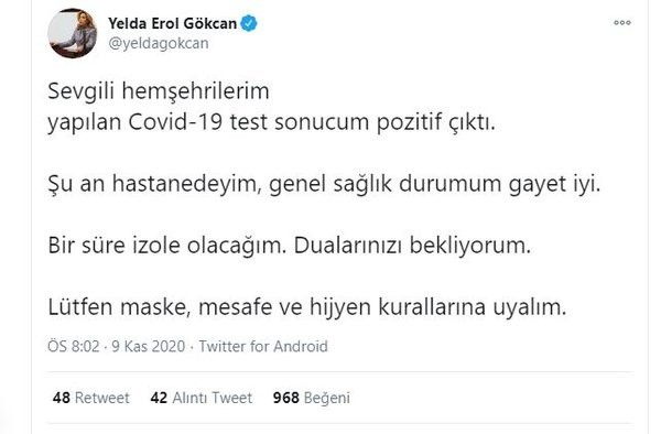 AK Parti Muğla Yelda Erol Gökcan: 'Yapılan Covid-19 test sonucum pozitif çıktı. Şu an hastanedeyim, genel sağlık durumum gayet iyi. Bir süre izole olacağım. Dualarınızı bekliyorum. Lütfen maske, mesafe ve hijyen kurallarına uyalım.'