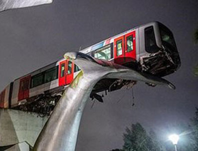 Hollanda’da metro istasyonunda meydana gelen kazada bakım için boş sefer yapan tren duramayarak bariyeri aşarak, 7.5 metre yükseklikteki dev balina heykeline çarptı. Metro istasyonu yetkilileri, kaza sırasında trenin boş olduğunu ve trendeki makinistin hafif şekilde yaralandığını açıkladı.