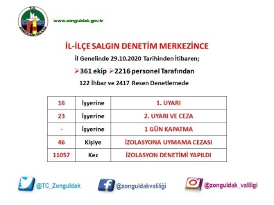 Zonguldak’ta il ve ilçe genelinde salgın denetim merkezince 361 ekip ve 2 bin 216 personel tarafından 110 bin 57 denetleme gerçekleştirildi.