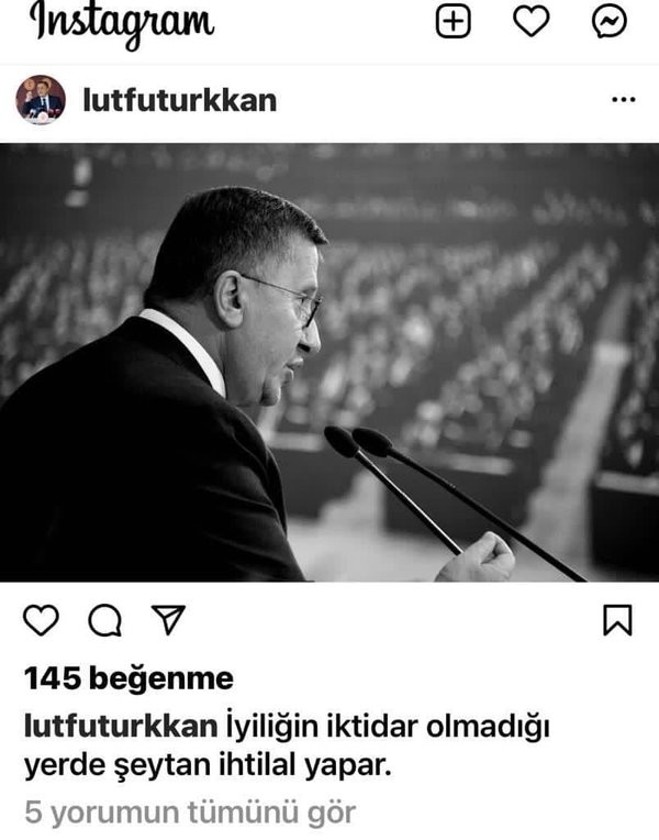 Geçtiğimiz günlerde İYİ Parti Bursa Milletvekili Ahmet Kamil Erozan'ın bütçe görüşmeleri sırasında "Bütçeyi iktisatlı kullanın, yılın ikinci yarısında biz alacağız" sözleriyle dikkat çekmişti. Bu darbe çağrısının ardından Kocaeli Milletvekili Lütfü Türkkan da Instagram'dan yaptığı paylaşımda "İyiliğin iktidar olmadığı yerde Şeytan ihtilal yapar" ifadelerini kullandı: