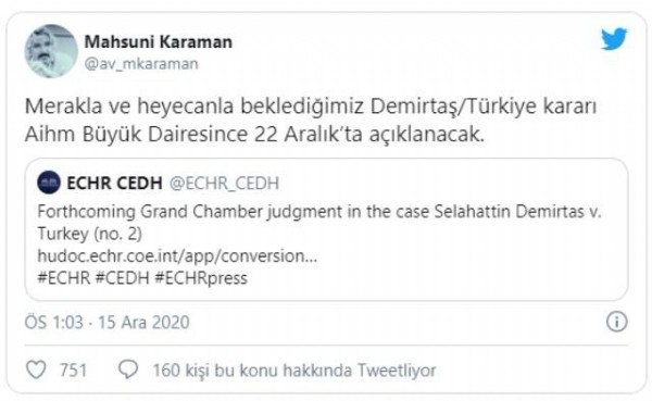 Terör tutuklusu HDP’li Selahattin Demirtaş'ın avukatı Mahsuni Karaman, AİHM Büyük Dairesi'nin Demirtaş hakkındaki kararını 22 Aralık'ta açıklayacağını duyurdu.