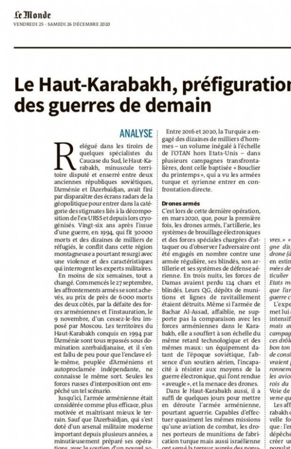 Türk SİHA'ları bölgenin kaderini belirleyen unsur olmaya devam ediyor. Fransız gazetesi Le Monde gazetesinde çıkan bir haberde "6 Bayraktar ile Ermenistan ordusunu mahvettiler. Suriye ve Libya'da olduğu gibi Karabağ'da da Rus sistemleri çaresiz kaldı. SİHA'lar gelecekte savaşların nasıl olacağını gösteriyor. Avrupa ders almalı" ifadelerine yer verildi. Türk SİHA'larına övgüler yağdıran Aliyev, 'Meşhur Bayraktar büyük değişikliğe neden oldu. Bu zaferimize büyük katkıda bulundu. Bütün dünya Türk halkının zekasını ve gelişmiş sanayisini bir kez daha gördü' demişti.