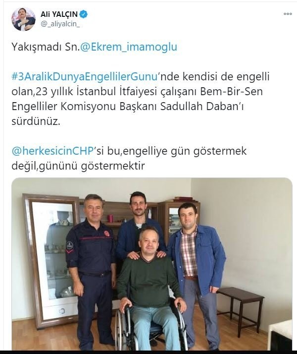 Eğitim-Bir-Sen Genel Başkanı Ali Yalçın: "Yakışmadı Sayın Ekrem İmamoğlu. 3 Aralık Dünya Engelliler Günü'nde kendisi de engelli olan, 23 yıllık İstanbul İtfaiyesi çalışanı Bem-Bir-Sen Engelliler Komisyonu Başkanı Sadullah Daban'ı sürdünüz. Bu, engelliye gün göstermek değil, gününü göstermektir."