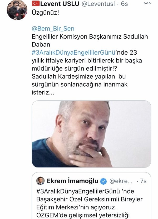 Belediye ve Özel İdare Çalışanları Birliği Sendikası (Bem-Bir-Sen) Genel Başkanı Memur-Sen Genel Başkan Yardımcısı Levent Uslu: "Üzgünüz! Bem Bir Sen Engelliler Komisyon Başkanımız Sadullah Daban. 3 Aralık Dünya Engelliler Günü'nde 23 yıllık itfaiye kariyeri bitirilerek bir başka müdürlüğe sürgün edilmiştir!? Sadullah kardeşimize yapılan bu sürgünün sonlanacağına inanmak isteriz..."