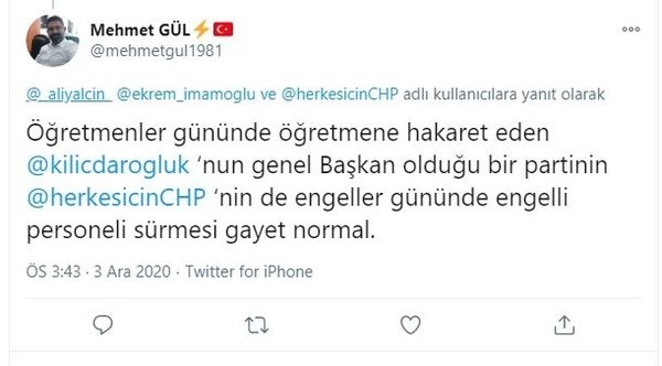 Eğitim-Bir-Sen Iğdır Teşkilat Başkanı Mehmet Gül: "Öğretmenler gününde öğretmene hakaret eden Kemal Kılıçdaroğlu'nun genel başkan olduğu bir partinin de engeller gününde engelli personeli sürmesi gayet normal."
