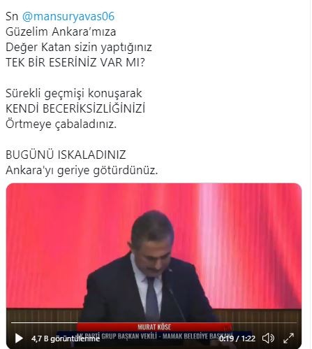 Ankara Büyükşehir Belediyesi Ak Parti Grup Başkanvekili, Mamak Belediye Başkanı Murat Köse CHP'li ABB'yi, Ankara Büyükşehir Belediye Başkanı Mansur Yavaş'ı eleştirdi.