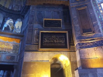 Cumhurbaşkanı Recep Tayyip Erdoğan’ın Ayasofya-i Kebir Cami-i Şerifi için bağışladığı ve üzerinde Al-i İmran Surelerinin 159’uncu ve 160’ıncı ayetlerinin yazılı olduğu hat tablosu görüntülendi.
