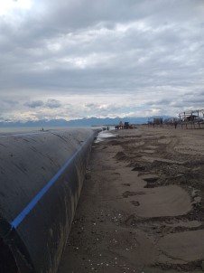 Antalya’nın Aksu ilçesi Kumköy Mahallesi’nde sahile dev boru vurdu. 200 metre uzunluğunda ve 1,5 metre çapındaki dev plastik boru görenleri şaşkına çevirdi. İlginç manzarayla karşılaşan vatandaşlar, kendi çabalarıyla boruyu sahilden çekmeye çalıştı. Vatandaşlar konuyla ilgili yetkililere bilgi verirken borunun nereden geldi anlaşılamadı. Borunun bulunduğu yerden alınması için çalışma başlatıldı.