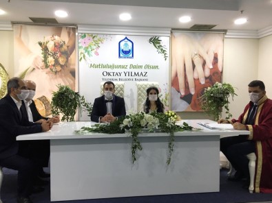 Yıldırım Nikâh Salonu’nda maskeli olarak nikâhları kıyılan Arife Abik ile Salih Ekin çiftinin nikâh merasimi de iki şahit eşliğinde gerçekleştirildi.