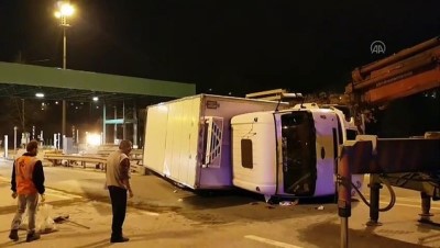 Çarpmanın etkisiyle savrulan kamyon, daha sonra gişe çıkışında devrildi.