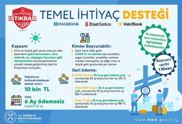 Hazine ve Maliye Bakanı Berat Albayrak sosyal medya hesabı Twitter'dan “Ekonomik İstikrar Kalkanı adımları kapsamında tüm kurumlarımızla, vatandaşımızın ihtiyaçlarına destek olmayı sürdürüyoruz. Bu kapsamda kamu bankalarımızla aylık 5 bin TL'nin altında geliri olan tüm vatandaşlarımız için Temel İhtiyaç Desteği'ni devreye aldık” mesajı paylaştı.