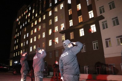 Yurtta görevli olan polis ekiplerinin de katıldığı organizasyonda karantinadaki vatandaşlar dakikalarca Türk bayraklarını sallayarak marşlar ve şarkılarla 23 Nisan’ı kutladı.