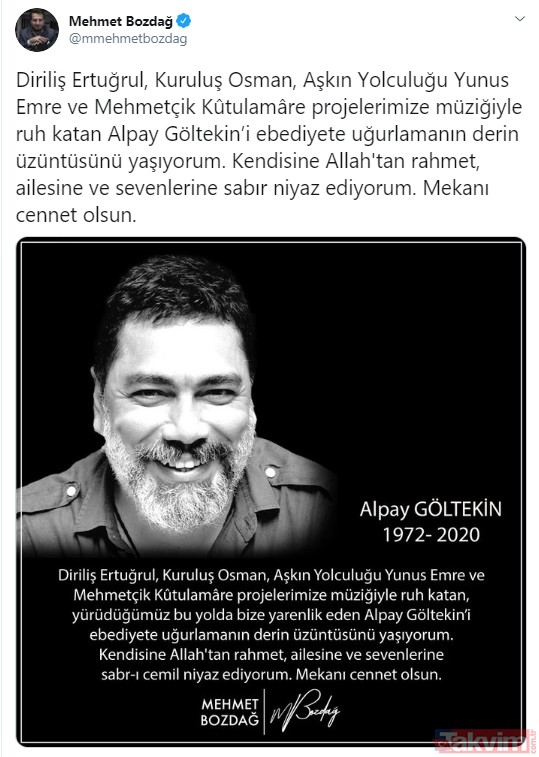 Diriliş Ertuğrul, Kuruluş Osman, Aşkın Yolculuğu Yunus Emre ve Mehmetçik Kûtulamâre projelerimize müziğiyle ruh katan Alpay Göltekin'i ebediyete uğurlamanın derin üzüntüsünü yaşıyorum. Kendisine Allah'tan rahmet, ailesine ve sevenlerine sabır niyaz ediyorum. Mekanı cennet olsun.