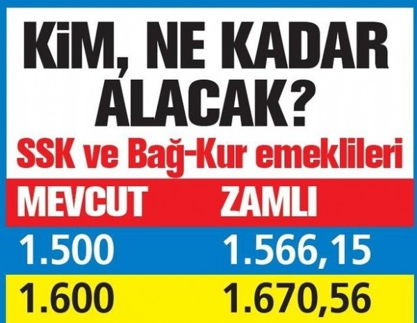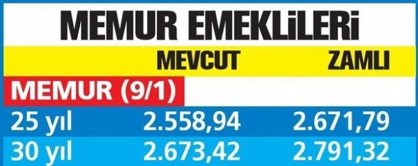 TAKVİM, bu orana göre yeni maaşları hesapladı. En düşük emekli maaşı; memurda 2 bin 778, esnafta bin 862, 2000'den önce emekli olan SSK'lılarda 2 bin 204 liraya yükselecek.