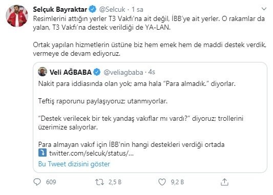 CHP Genel Başkan Yardımcısı Veli Ağbaba, Selçuk Bayraktar'ın şahsına verdiği cevaplar üzerine yeni açıklama yaptı ve "Nakit para iddiasında olan yok; ama hala 'Para almadık' diyorlar. Teftiş raporunu paylaşıyoruz; utanmıyorlar. 'Destek verilecek bir tek yandaş vakıflar mı vardı?' diyoruz; trollerini üzerimize salıyorlar. Para almayan vakıf için İBB'nin hangi destekleri verdiği ortada" iddiasında bulundu.