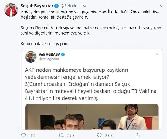 "Ama (Veli Ağbaba) yetmiyor, çarpıtmaktan vazgeçemiyorsun. İlk de değil. Önce nakit diye başladın, sonra lafı desteğe çevirdin. Seçim döneminde kirli siyasetine malzeme yapmak için benzer iftirayı yayan seni ve diğerlerini mahkemeye verdik. Bunu da ilave delil yaparız."