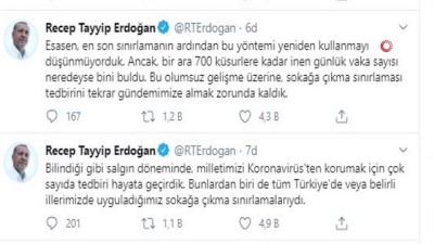 Cumhurbaşkanı Erdoğan, Twitter hesabından yaptığı paylaşımda, salgın döneminde, milleti koronavirüsten korumak için çok sayıda tedbirin hayata geçirildiğini anımsattı. Bunlardan birinin de tüm Türkiye'de veya belirli illerde uygulanan sokağa çıkma sınırlamaları olduğunu belirten Erdoğan, "Esasen, en son sınırlamanın ardından bu yöntemi yeniden kullanmayı düşünmüyorduk. Ancak, bir ara 700 küsurlara kadar inen günlük vaka sayısı neredeyse bini buldu. Bu olumsuz gelişme üzerine, sokağa çıkma sınırlaması tedbirini tekrar gündemimize almak zorunda kaldık." ifadelerini kullandı.