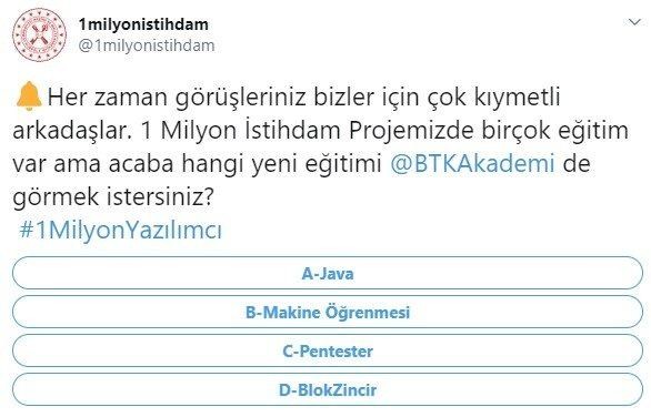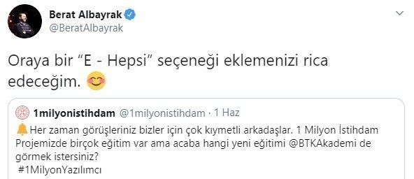 Bakan Albayrak, Hazine ve Maliye Bakanlığına bağlı '1milyonistihdam' hesabının, "Her zaman görüşleriniz bizler için çok kıymetli arkadaşlar. 1 Milyon İstihdam Projemizde birçok eğitim var ama acaba hangi yeni eğitimi @BTKAkademi de görmek istersiniz?" anketine, "Oraya bir "E - Hepsi" seçeneği eklemenizi rica edeceğim" ifadeleriyle yanıt verdi.