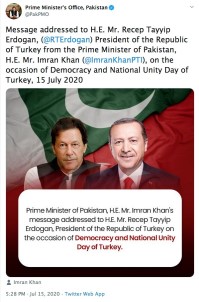 Khan, "Hükümet, Pakistan halkı adına ve kendi adıma Demokrasi ve Milli Birlik Günü vesilesiyle kardeş insanlar ve Türkiye hükümeti ile dayanışmamızı tekrar teyit etmek istiyorum. Dört yıl önce, bu gün Türk halkı, Türkiye’nin barış ve istikrarını, demokratik kurumlarını hedef alan karanlık güçlerine meydan okumak için direncini ve efsanevi cesaretini gösterdi" ifadelerini kullandı.
