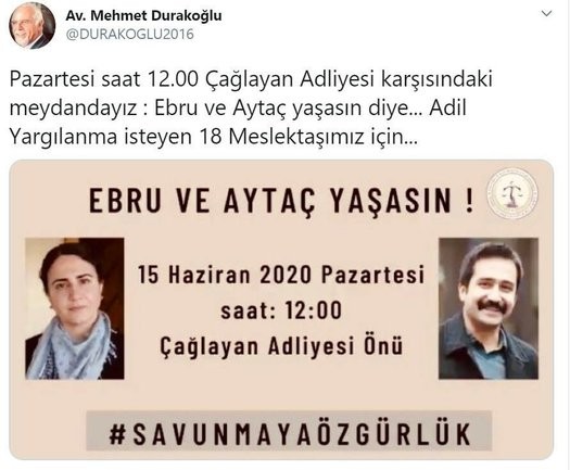 İstanbul Barosu Başkanı Mehmet Durakoğlu,terör örgütü DHKP-C üyeliğinden hüküm giyen ve cezaevinde eylem başlatan Ebru Timtik ve Aytaç Ünsal için 'Onlara kayıtsız kalmayalım" çağrısı yaptı. Timtik ve Ünsal, Savcı Mehmet Selim Kiraz'ın şehit edildiği hain saldırının ardından başlatılan operasyonla yakalanarak tutuklanmıştı.