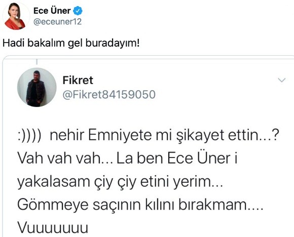 Twitter kullanıcısı, 'Ben Ece Üner'i yakalarsam çiğ çiğ etini yerim... Gömmeye saçının kılını bırakmam...' diyerek tehdit savurdu. Üner, sosyal medya hesabı üzerinden tehdit eden kişiye, 'Hadi bakalım gel buradayım!' diye yanıt verdi.