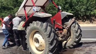 Hamam Boğazı Mahallesi Çatalçam mevkisinde kavşaktan yolun karşısına geçmeye çalışan Halil İbrahim Baral yönetimindeki 15 DH 809 plakalı traktör, karşı yönden gelen Ali Eren Ağırbaş'ın kullandığı 06 ETS 96 plakalı otomobille çarpıştı.