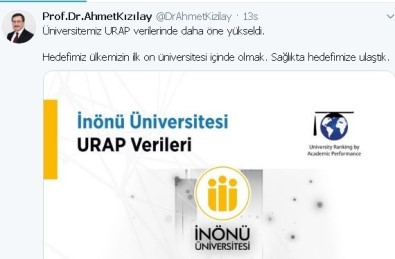 İnönü Üniversitesi Rektörü Prof.Dr. Ahmet Kızılay, URAP’ta devlet üniversiteleri arasında 25.sıraya yükselmelerini değerlendirirken, “ Üniversitemiz University Ranking By Academic Performance(URAP) verilerinde daha öne yükseldi. Hedefimiz ülkemizin ilk on üniversitesi içinde olmak. Sağlıkta hedefimize ulaştık” dedi.