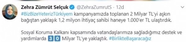 Aile, Çalışma ve Sosyal Hizmetler Bakanı Zehra Zümrüt Selçuk, Biz Bize Yeteriz Türkiyem Kampanyası'nda toplanan 2 milyar TL'yi aşkın bağıştan yaklaşık 1,2 milyon ihtiyaç sahibi haneye 1.000'er TL'lik yardım yapıldığını belirtti.