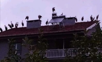 Kütahya’nın Şaphane ilçesinde göç eden leylek sürüsü, şiddetli yağmur nedeniyle mola vererek binaların çatısında yağmurun dinmesini bekledi.