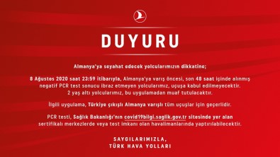 Türk Hava Yolları’nın resmi sosyal medya platformlarından konuya ilişkin yapışan paylaşımda, "Almanya’ya seyahat edecek yolcularımızın dikkatine; 8 Ağustos saat 23.59 Almanya’ya varış öncesi, son 48 saat içerisinde alınmış negatif PCR sonucu ibraz etmeyen yolcularımız, uçuşa kabul edilmeyecektir. 2 yaş altı yolcularımız, bu uygulamadan muaf tutulacaktır. İlgili uygulama, Türkiye çıkışlı Almanya varışlı tüm uçuşlar için geçerlidir. PCR testi, Sağlık Bakanlığı’nın covid19bilgi.saglik.gov.tr sitesinde yer alan sertifikalı merkezlerde veya test imkanı olan havalimanlarında yaptırılabilecektir" denildi.