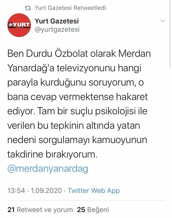 'Ben Durdu Özbolat, Merdan Yanardağ'ın bu akşamki sözlerine cevabımdır. Ben Yurt Gazetesi'ni evimi, otelimi, özel okulumu enerji hisselerimi satıp 25 milyon dolar harcayarak kurdum, kaynağım belli. Sen Tele 1'in kaynağı nedir onu açıkla?'