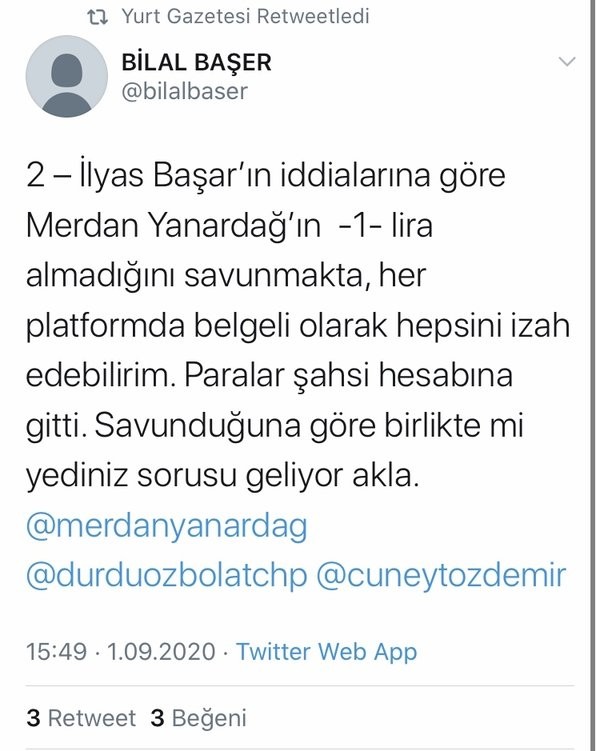 İlyas Başar'ın iddialarına göre Merdan Yanardağ'ın -1- lira almadığını savunmakta, her platformda belgeli olarak hepsini izah edebilirim. Paralar şahsi hesabına gitti. Savunduğuna göre birlikte mi yediniz sorusu geliyor akla?