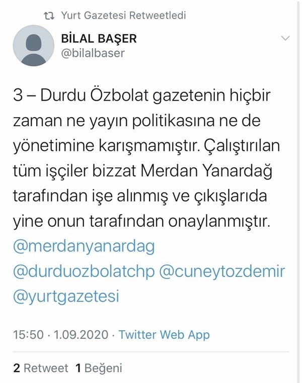 Durdu Özbolat, Yurt Gazetesi'nin sosyal paylaşım sitesi Twitter'daki şahsi hesabından açıklamada bulundu ve Tele 1 Genel Yayın Yönetmeni Merdan Yanardağ'a Tele 1 Televizyonu'nun hangi parayla kurulduğunu sordu.