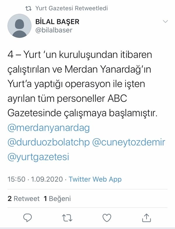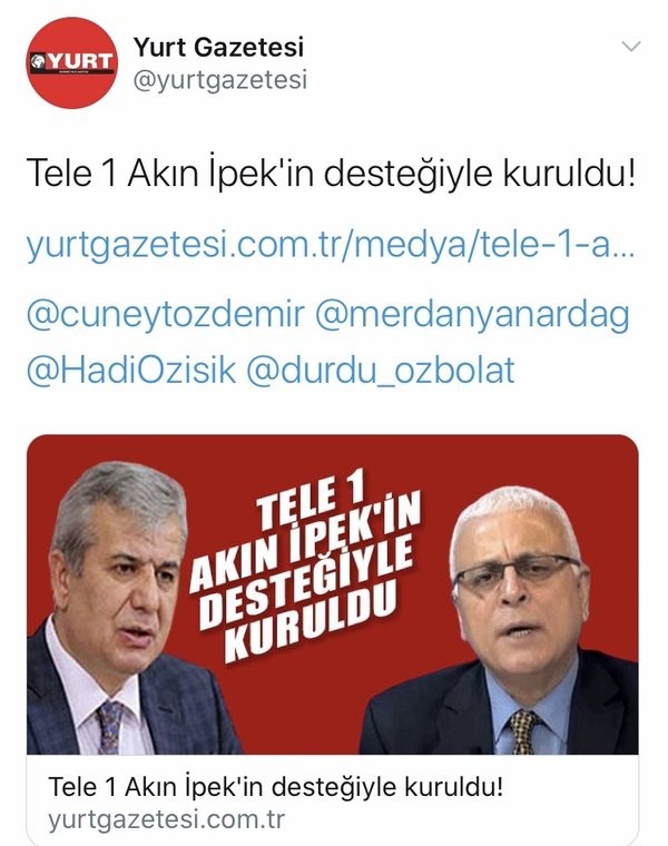 'Tele 1 Akın İpek'in desteğiyle kuruldu! Dün akşam saatlerinde Cüneyt Özdemir'in paylaştığı bir haber üzerinden Yurt Gazetesi'ni hedef alan eski çalışanımız Merdan Yanardağ'a Durdu Özbolat'ın cevabıdır.'