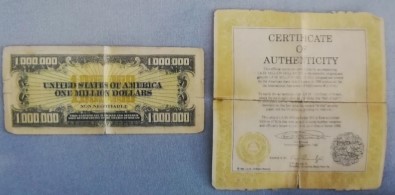 Kütahya’nın Tavşanlı ilçesinde, ABD Merkez Bankası tarafından kolleksiyon amacıyla sınırlı sayıda bastırılan paralardan olduğu tahmin edilen 1 milyon dolar banknot ve buna ait sertifikası ele geçirildi.