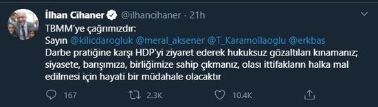 CHP'li İlhan Cihaner de Meclis'e çağrıda bulundu. Cihaner, CHP lideri Kemal Kılıçdoğlu, İyi Parti lideri Meral Akşener, Saadet Partisi lideri Temel Karamollaoğlu ve TİP Genel Başkanı Erkan Baş'a 'HDP'yi ziyaret ederek hukuksuz gözaltıları kınamanız; siyasete, barışımıza, birliğimize sahip çıkmanız, olası ittifakların halka mal edilmesi için hayati bir müdahale olacaktır' diye seslendi..