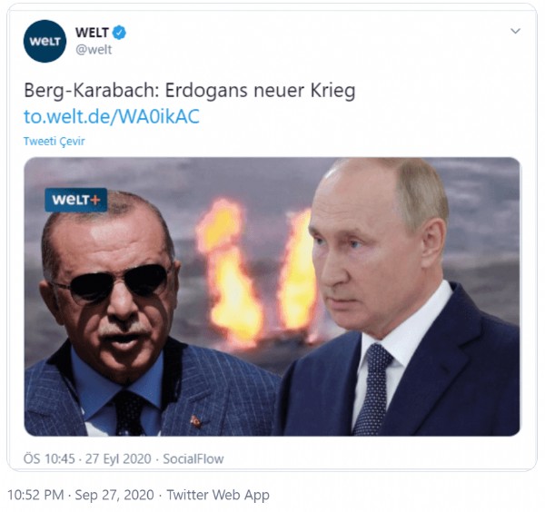 Azerbaycan ve Ermenistan arasında işgal altındaki Dağlık Karabağ'da yaşanan çatışmalar hakkında haber yapan Alman Welt gazetesi başlığında, "Dağlık Karabağ Erdoğan’ın yeni savaşı" diyerek Türkiye'yi hedef aldı.