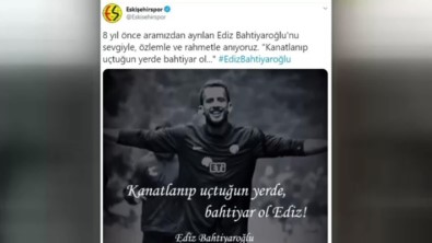 Ediz Bahtiyaroğlu’nu vefatının 8. yıl dönümünde sosyal medya hesabından yaptığı paylaşımla anan Eskişehirspor, "Kanatlanıp uçtuğun yerde bahtiyar ol” notuna yer verdi. ‘Tükenmiş Nefeslere’ bestesi eşliğinde duysal bir video da paylaşan EsEs, Ediz’i unutmadı.