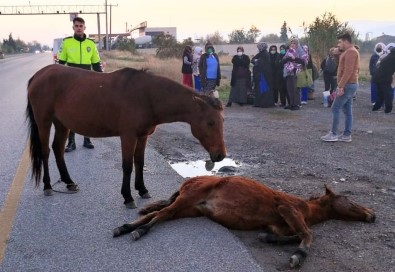 Aydin-Denizli Karayolu üzerinde meydana gelen kazada aracin çarptigi tay telef olurken, anne atin dakikalarca yavrusunun basindan ayrilmamasi vatandaslari duygulandirdi.
