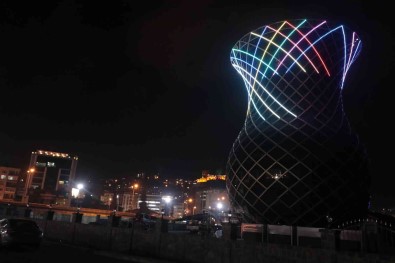 Rize’de yapimi devam eden 22 metrelik dev çay bardagi isiklandirilmaya baslayinca ortaya rengarenk bir görüntü çikti.
