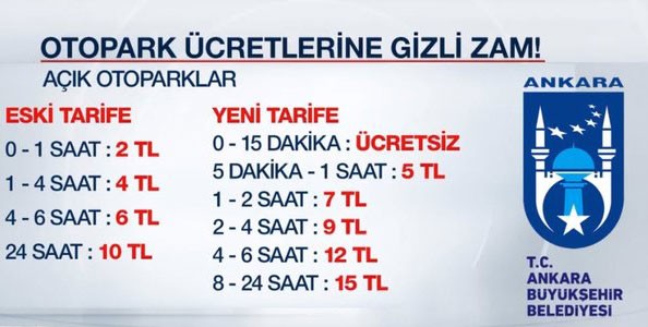 Ankara'da otopark ücretlerine 6 ayda ikinci zam yapıldı. Eski tarife ile yeni tarife kıyaslandığında yüzde 50 ile yüzde 100 arasında bir artış yapıldığı gözlendi.