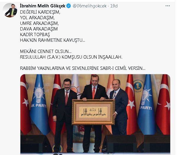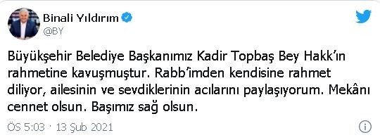 Binali Yıldırım: Büyükşehir Belediye Başkanımız Kadir Topbaş Bey Hakk'ın rahmetine kavuşmuştur. Rabb'imden kendisine rahmet diliyor, ailesinin ve sevdiklerinin acılarını paylaşıyorum. Mekânı cennet olsun. Başımız sağ olsun.