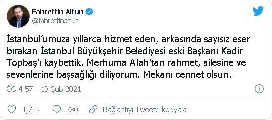 Fahrettin Altun: İstanbul'umuza yıllarca hizmet eden, arkasında sayısız eser bırakan İstanbul Büyükşehir Belediyesi eski Başkanı Kadir Topbaş'ı kaybettik. Merhuma Allah'tan rahmet, ailesine ve sevenlerine başsağlığı diliyorum. Mekanı cennet olsun.