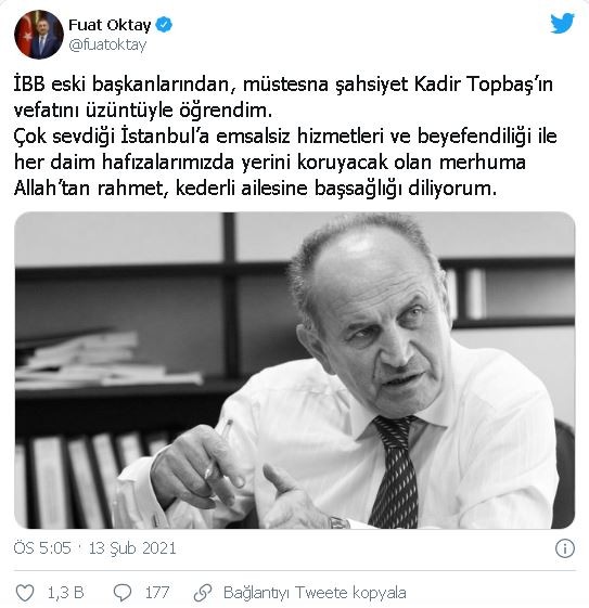 Fuat Oktay: İBB eski başkanlarından, müstesna şahsiyet Kadir Topbaş'ın vefatını üzüntüyle öğrendim. Çok sevdiği İstanbul'a emsalsiz hizmetleri ve beyefendiliği ile her daim hafızalarımızda yerini koruyacak olan merhuma Allah'tan rahmet, kederli ailesine başsağlığı diliyorum.