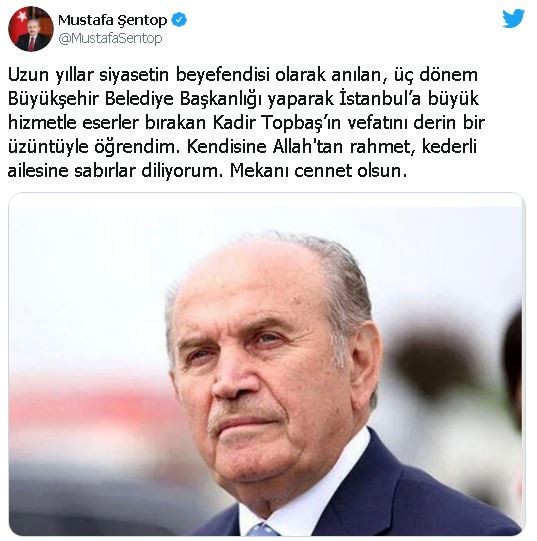 Mustafa Şentop: Uzun yıllar siyasetin beyefendisi olarak anılan, üç dönem Büyükşehir Belediye Başkanlığı yaparak İstanbul'a büyük hizmetle eserler bırakan Kadir Topbaş'ın vefatını derin bir üzüntüyle öğrendim. Kendisine Allah'tan rahmet, kederli ailesine sabırlar diliyorum. Mekanı cennet olsun.