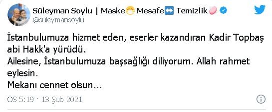 Süleyman Soylu: İstanbulumuza hizmet eden, eserler kazandıran Kadir Topbaş abi Hakk'a yürüdü. Ailesine, İstanbulumuza başsağlığı diliyorum. Allah rahmet eylesin. Mekanı cennet olsun...