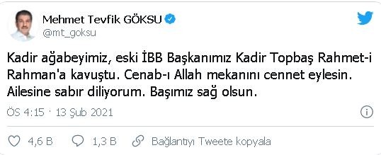Esenler Belediye Başkanı Mehmet Tevfik Göksu, sosyal medya hesabı üzerinden yaptığı açıklamada, 'Kadir ağabeyimiz, eski İBB Başkanımız Kadir Topbaş Rahmet-i Rahman'a kavuştu. Cenab-ı Allah mekanını cennet eylesin. Ailesine sabır diliyorum. Başımız sağ olsun' dedi.